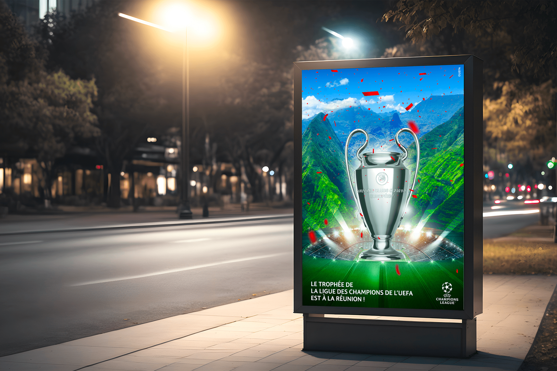 La Réunion France in May, 2023. It was created for the brand: Heinken and UEFA. This Design, Digital, and Print media campaign aims to the coming of the champions league trophy with a special guest Marcel Desailly
